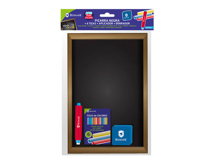 Pizarra negra con marco de madera y portatizas, 6 tizas y borrador. Se puede colgar. Medidas 30 x 20 cm.
